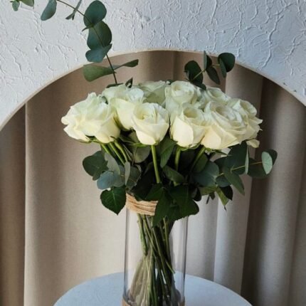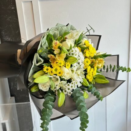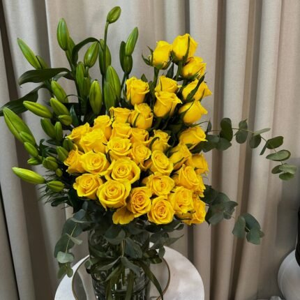 مزهرية حكاية هي مجموعة الورد الاصفر مع ازهار الليليوم وازهار الكليبتوس الجميل والرائع