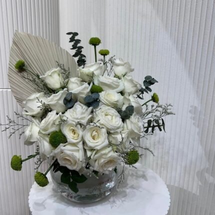 مجموعه من ازهار الجوري البيضاء مع الكريز الاخضر وريشة السعف