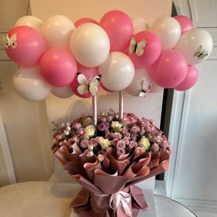 باقه ورد مع قوس بالونات بالوان جميله وجذابه من ورد موف وجوري ابيض وفراشات تعطي منظر رائع