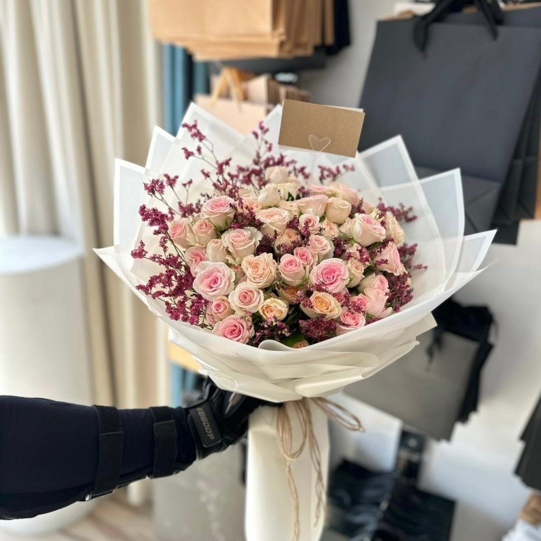 مجموعه من ازهار البيبي روز مع زهرة اللمنيوم بتغليف ابيض مثلثات بعدد 20 غصن بيبي روز