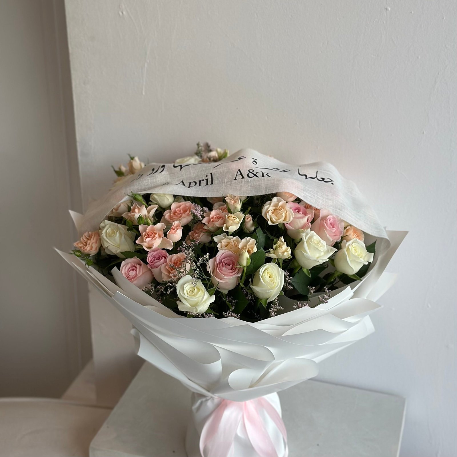 باقة لطيفه بالوان هادئه وجميله بشريطه بيضاء والعباره من اختيارك