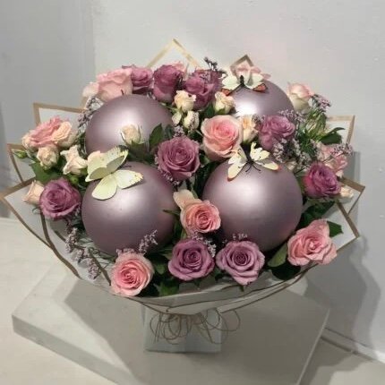 باقة بارتي بالون باقة ازهار مع بلونات رائعه وفراشات لطيفه