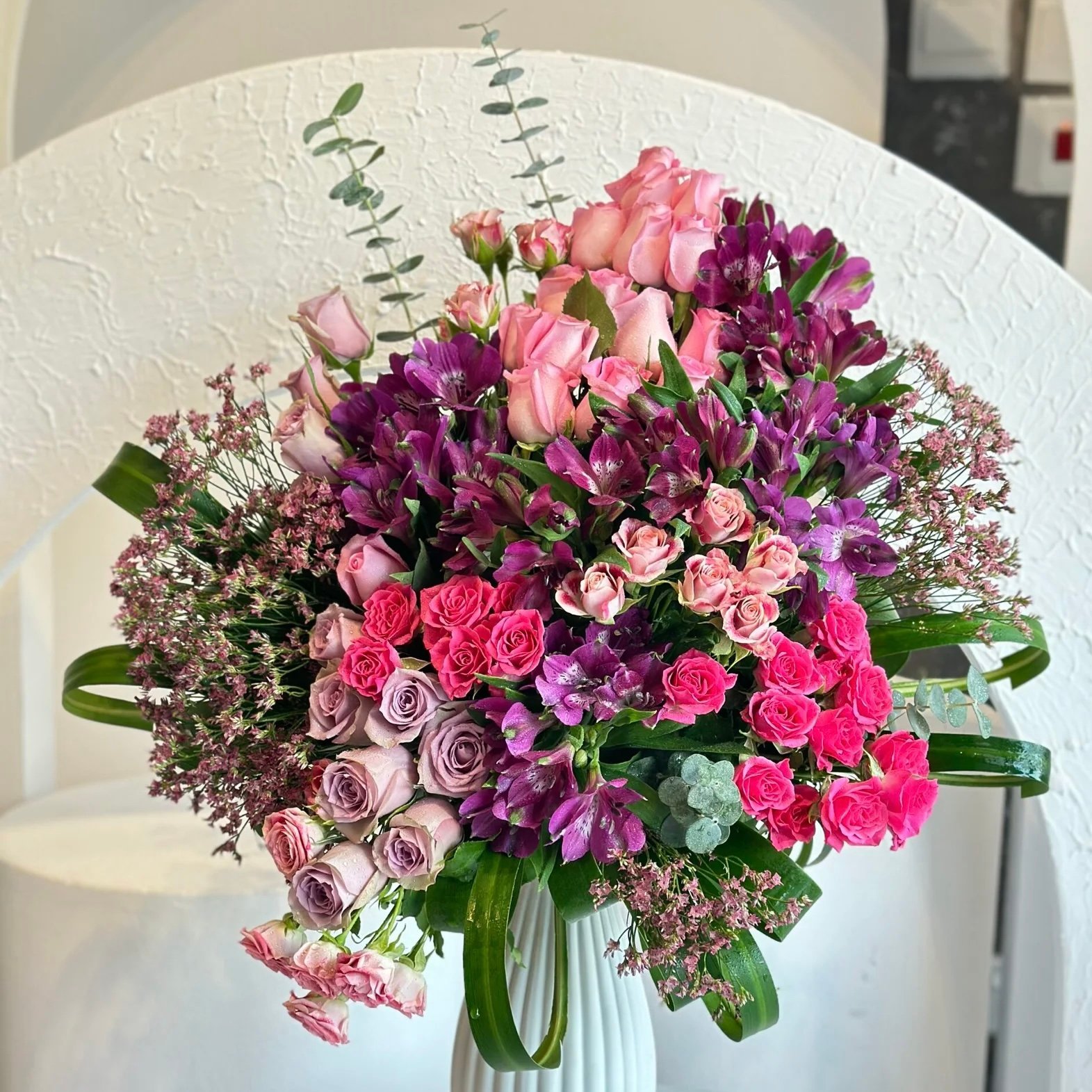 باقة الزهور الورديه من ازهار البيبي روز والاستوميرا واللمنيوم